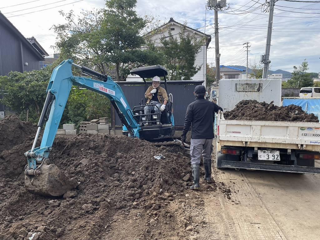▼ 午後3時過ぎ。怒涛のピストン搬出で何十回往復して頂いたか分かりませんが、見事に完了!!あとは細かな作業も行いますが大量の汚泥が取り除けた事で匂いも軽減出来ました。今度雨が降っても地面に浸み込んで行きますし、道路に土が流れ出てしまう事も無いと思います。