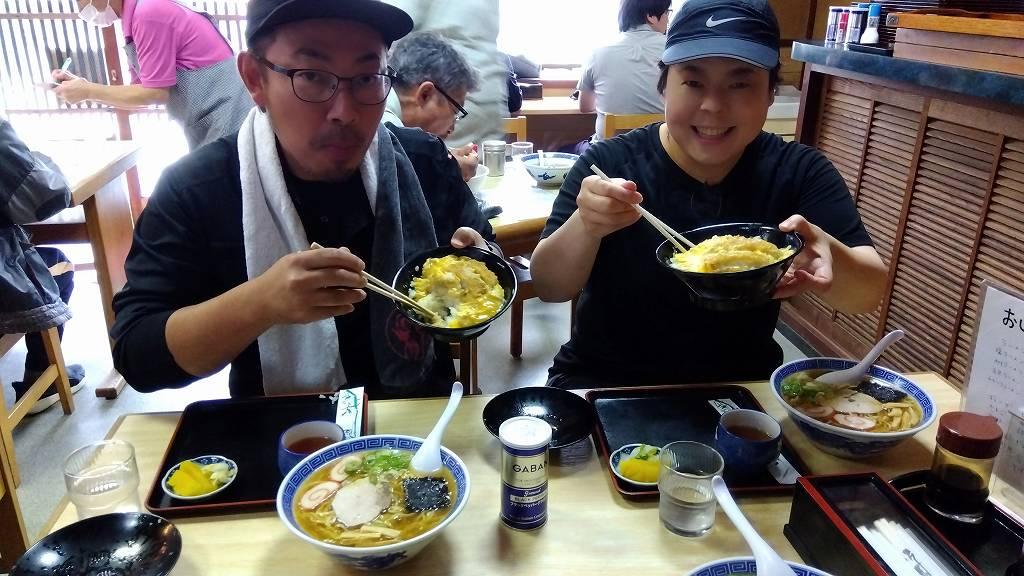 ▲ 若者の永遠のロマン!?…「かつ丼+ラーメン」(笑)礒辺さん(女性)にも「いっちゃえいっちゃえ~!食べきれんかったらもらうから!」と半ば強引にお勧めし、皆で喰らふ(笑)。もぐもぐ食べる!美味しい!!元気出る!!「元気があれば何でもできる!頑張れる!」。