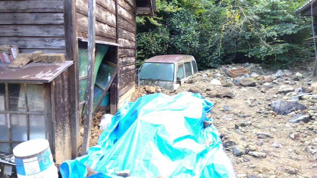 ただ、一段下のお宅(上記写真とは異なる状況です)では「家を直してここに住みます」と言っていると伺いました。そのお宅ではプリウスが窓付近まで土砂に埋まっていて、家の周りにも土砂だらけな状態…。私としては「このお宅の敷地内土砂の掘削でしたら可能です」とお答えしました。山が崩れた集落を一挙に全てボランティアで何とかするというのは無理です!言い切ります!そんなことはボランティアの範疇を超えます。でも!ここで暮らすという方の庭先・家周りの土砂を取る事なら私にはできます(このあたりのニュアンスって現場を見た方にしか解らないと思います)。