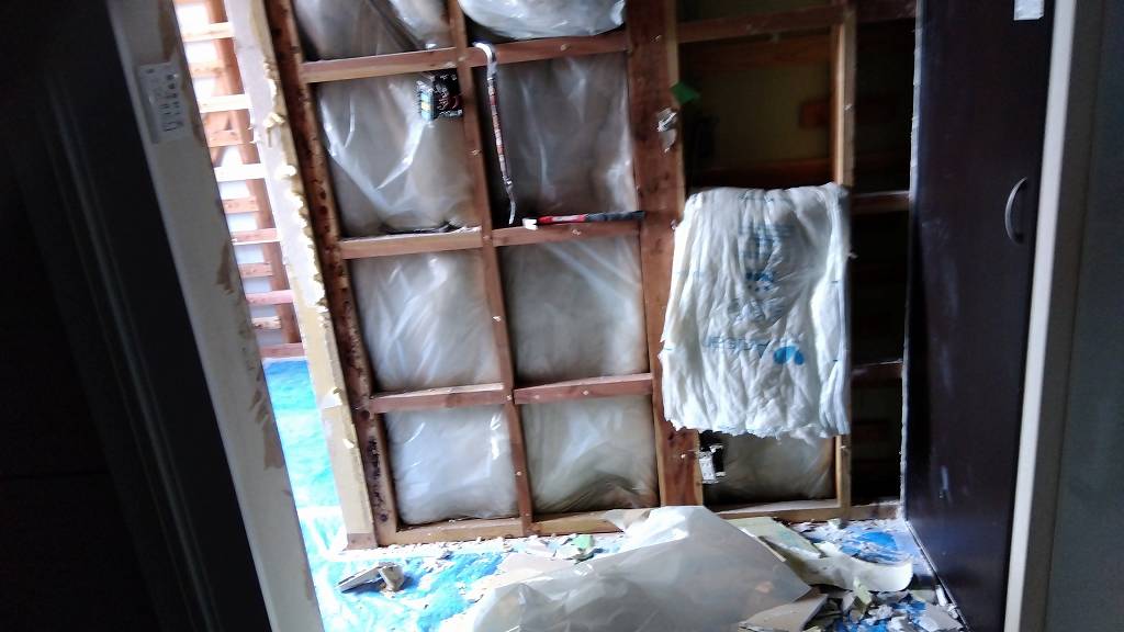 石膏ボード…グラスウール…水を含んでズブズブです。このお宅では床から90㎝付近まで浸水したそうなので、水でブカブカになってしまった部分を取り除きます。私は「マルチツール何て邪道だ!」と思っていたので持っていませんが、今回使ってみたら便利でした(^^;今度買おうかなぁ…。