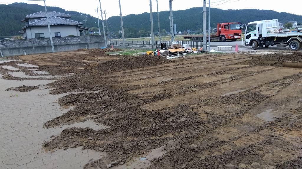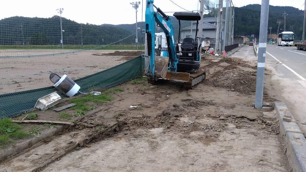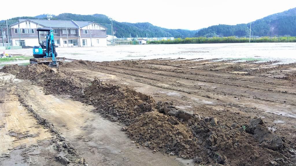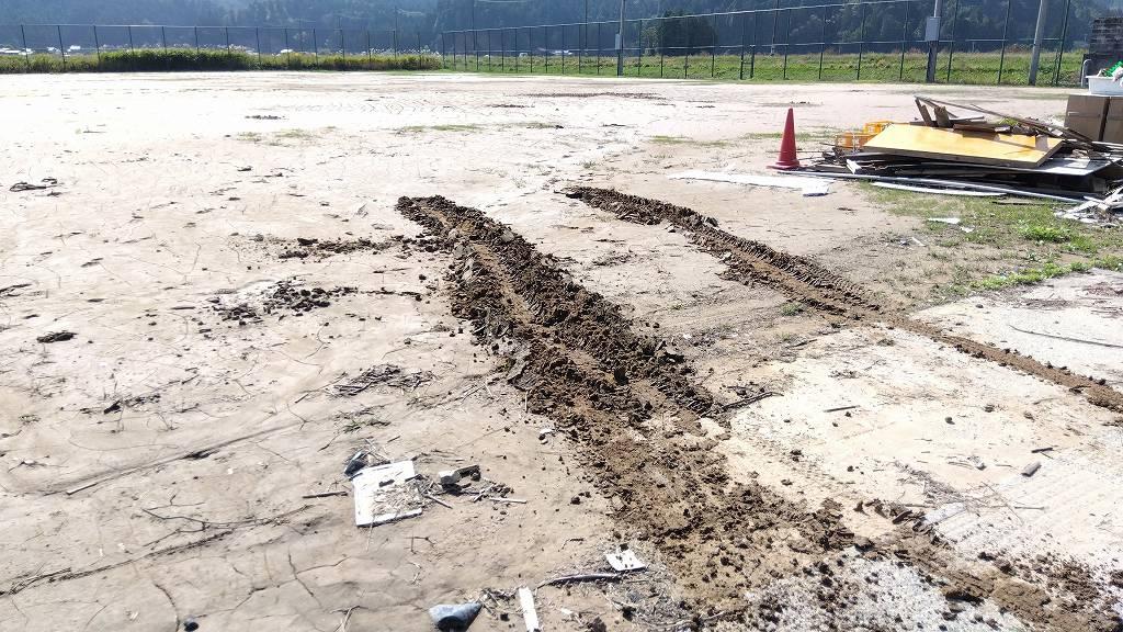 このグラウンドは自衛隊や消防救急などのヘリポートとしても使わなければなりませんし、現在はグラウンドに車が入れない状態なので路上駐車しか手立てがなく、ボラセンのある中心街はカオスと化しているのです。この泥を排除して(或いは端に寄せて)車両が入れるようになったら、公費解体やボランティアバスや、皆様の復興に大きく役立つとの事。終わる気がしないけど、やる事にしました。本当はバックホーよりホイルローダーの作業の方が10倍以上速いんですが、ありません…。バックホーで頑張ります。