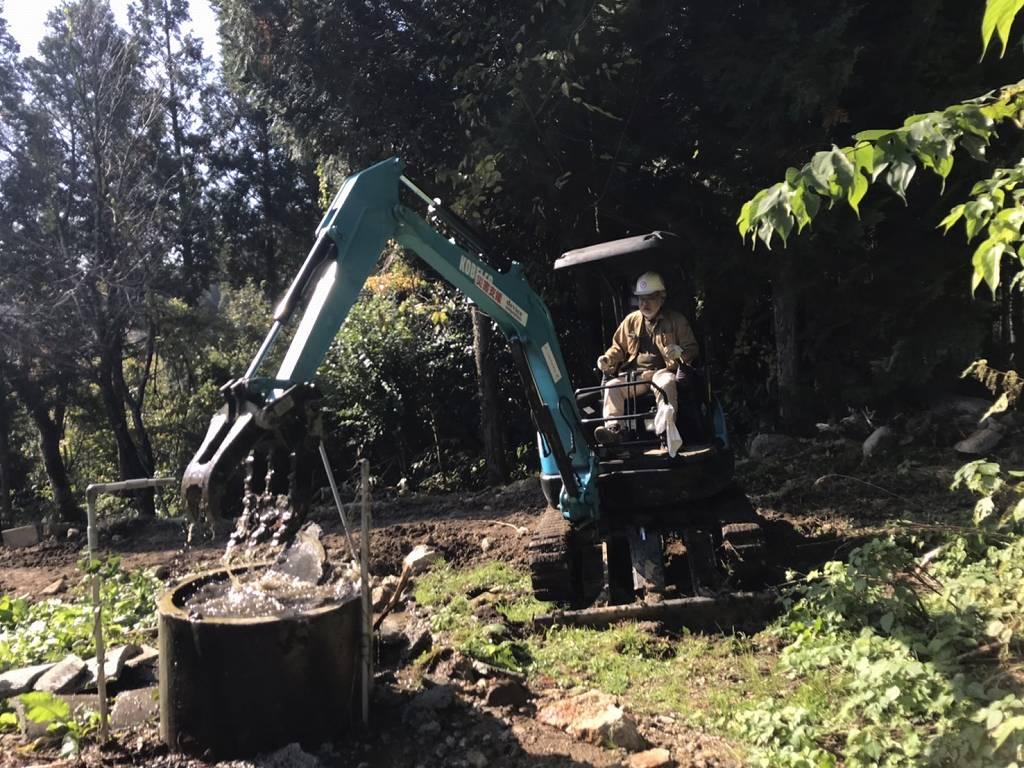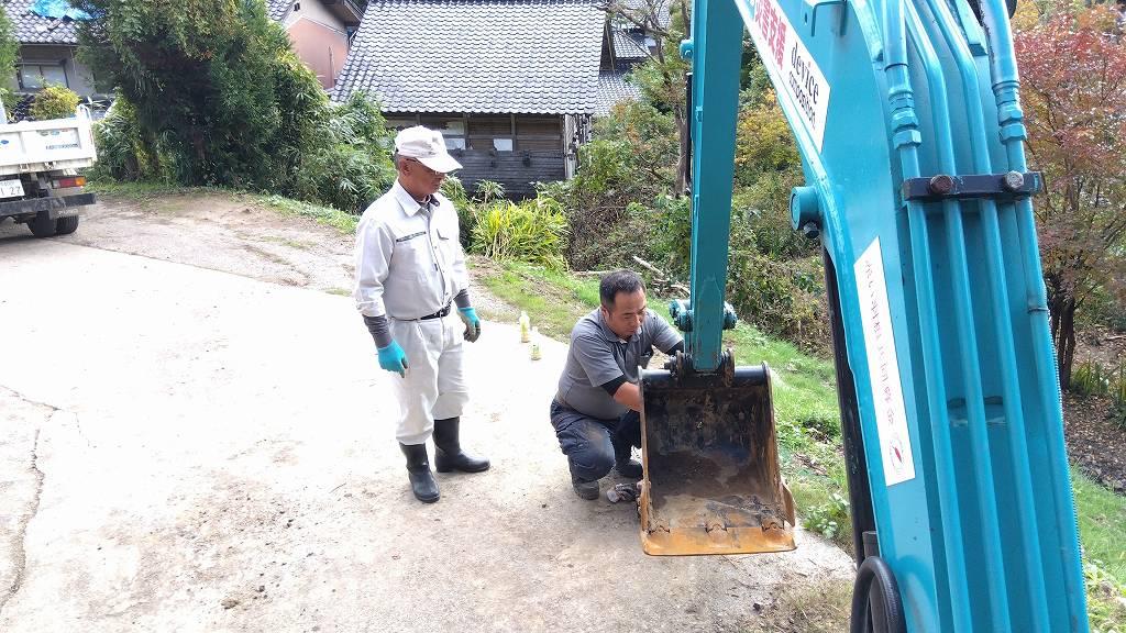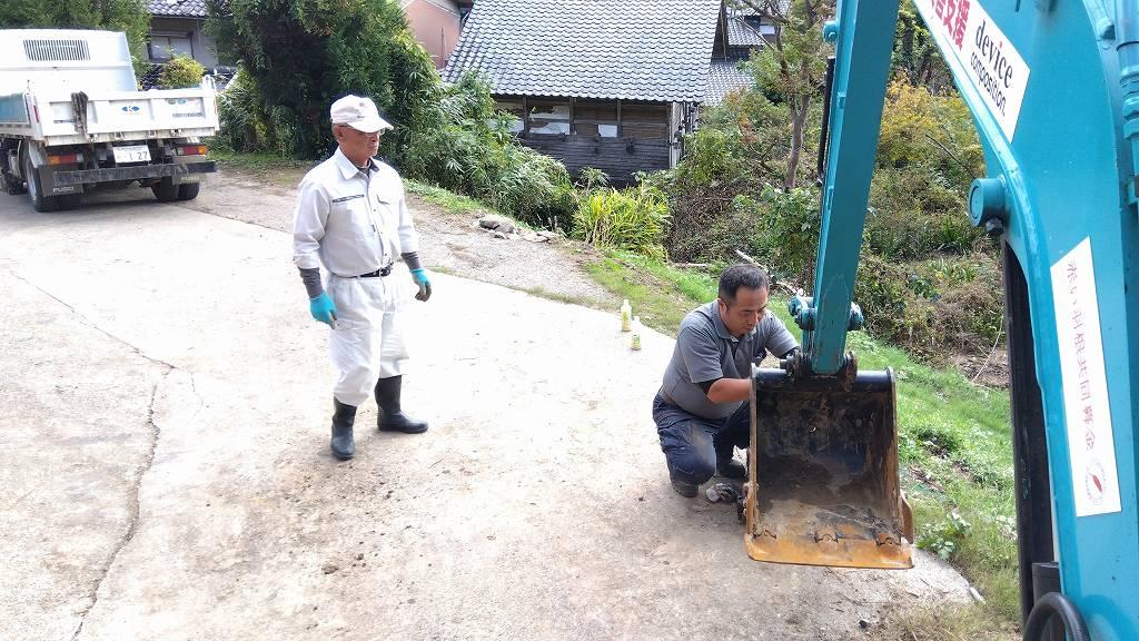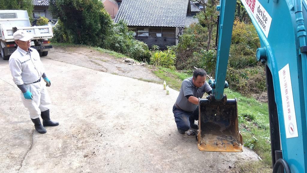 ▼ バックホーをツカミからバケットに交換する作業を開始!どういう訳か、山田先生と作業する時に交換する事が重なりますね(笑)。このアタッチメント交換は結構面倒なんです…。でもこれが出来なきゃバックホー乗りではありません。それくらい大切な作業です。