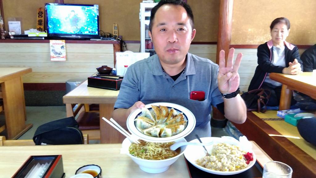 ▼ 山田先生と昼食。輪島市街地で被災しつつも必死に店を開けている「かど長食堂」さんに行って、一緒に三倍飯を食らふ(笑)