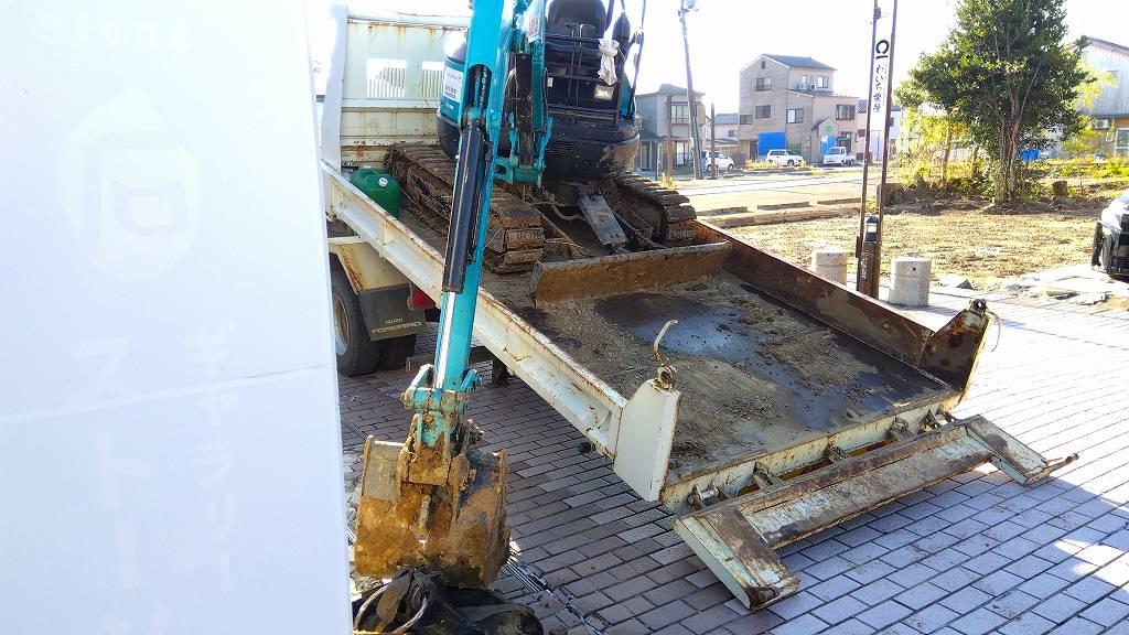 朝7時…お店の前に到着。でも変な所に支柱があって重機を降ろすポジションに悩みます。石は物凄く重いので石の場所とダンプを遠ざけたくないんです…。重機よりもダンプの寄せ込みの方が難しいモノなんだな~と痛感します。当日誌に良く登場いただく「ダンプ魔術師 山田さん」は、こういう所が上手なんですよ!