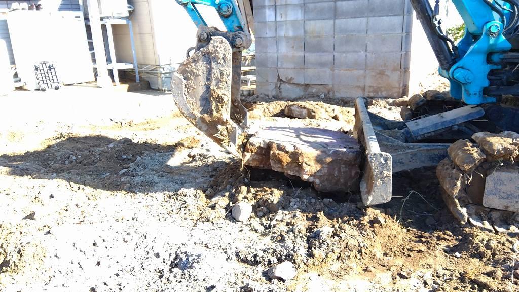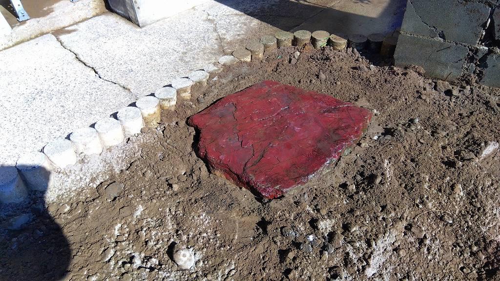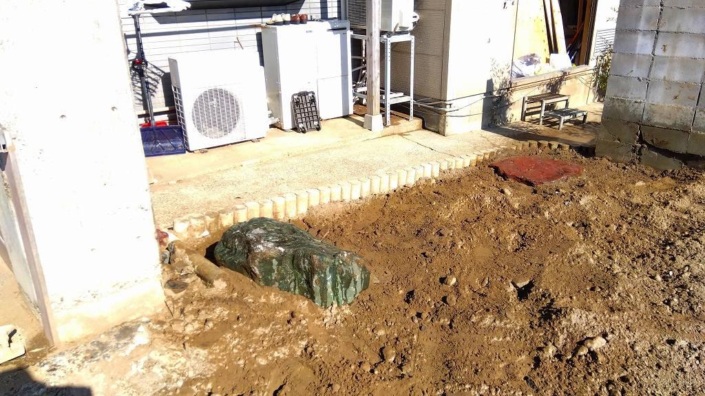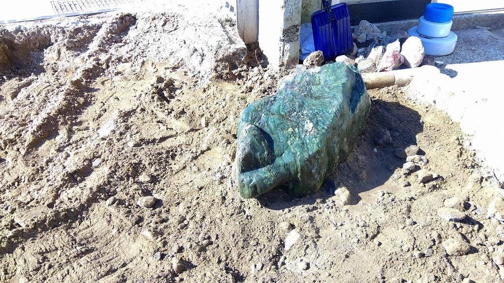 一番左の巨石は無理なので、地面に埋まっている赤い石(佐渡の赤石)と手前の緑の石を取り出します。
