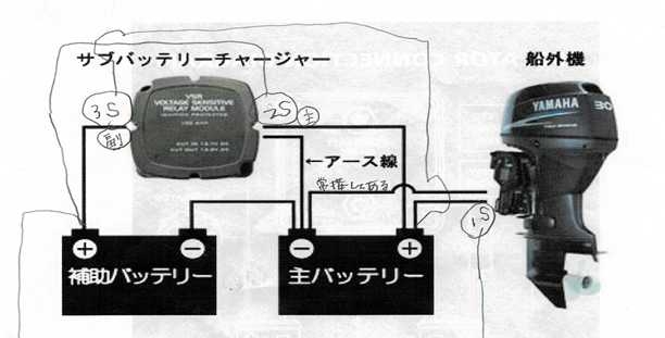 ① 船外機オルタネータからバッテリーへ充電できるようにした。